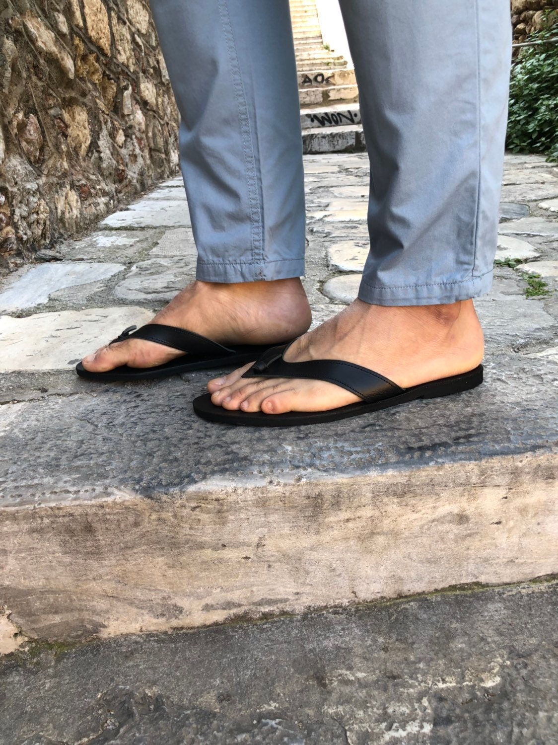 A handmade pair of flip flop sandals for men with a knot at the center of it that is made from full grain leather in black color. Wear the original flip flops that are made from Greece. Find them only at us Store.