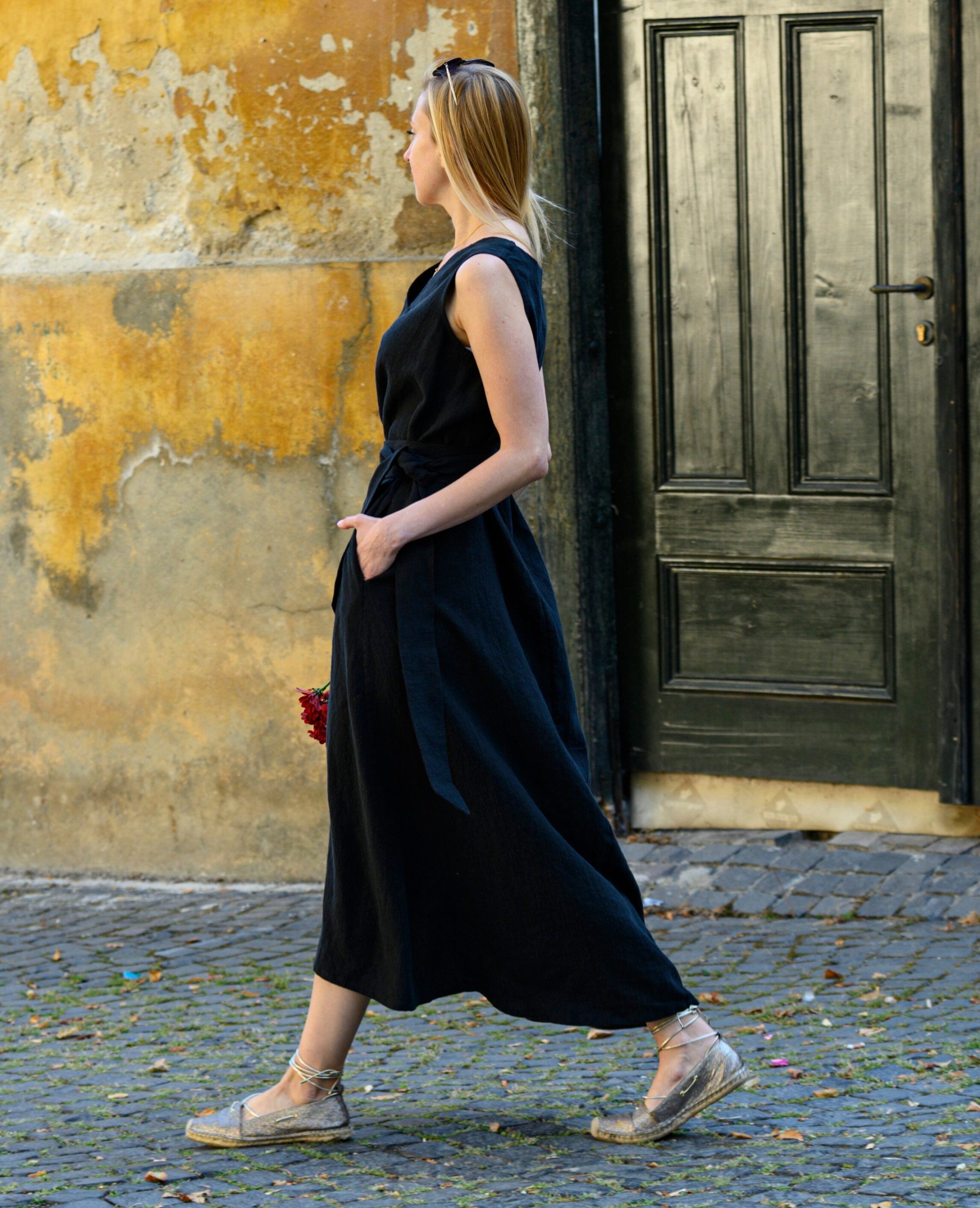 Try the maxi version of our handmade V-neck flared linen dress. With a simple, unpretentious but elegant silhouette, this feminine linen dress is everything you imagined and more! Created from high quality pure linen, this piece has a deep V-neckline at the front and a gorgeous maxi high-low flared bottom. Pair it with flats, sneakers or high heeled sandals and look fabulous in this relaxed summer gown!